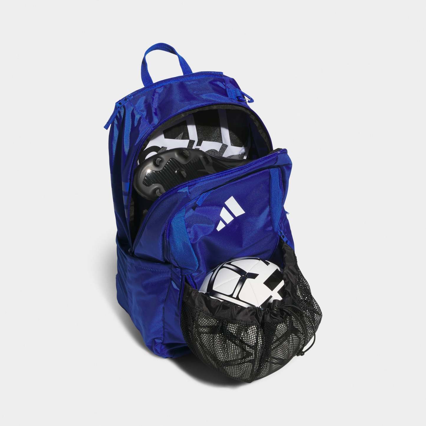 Made from lightweight, durable polyester, this versatile adthtidas backpack keeps stuff organized and dry thanks to a water-resistant base. Multiple zip pockets keep your gear separated, including one that can hold a size 5 soccer ball and two mesh side pockets that can each hold a 32 oz water bottle. There's also a vented pocket to store dirty gear and a clip to attach essentials. Score!