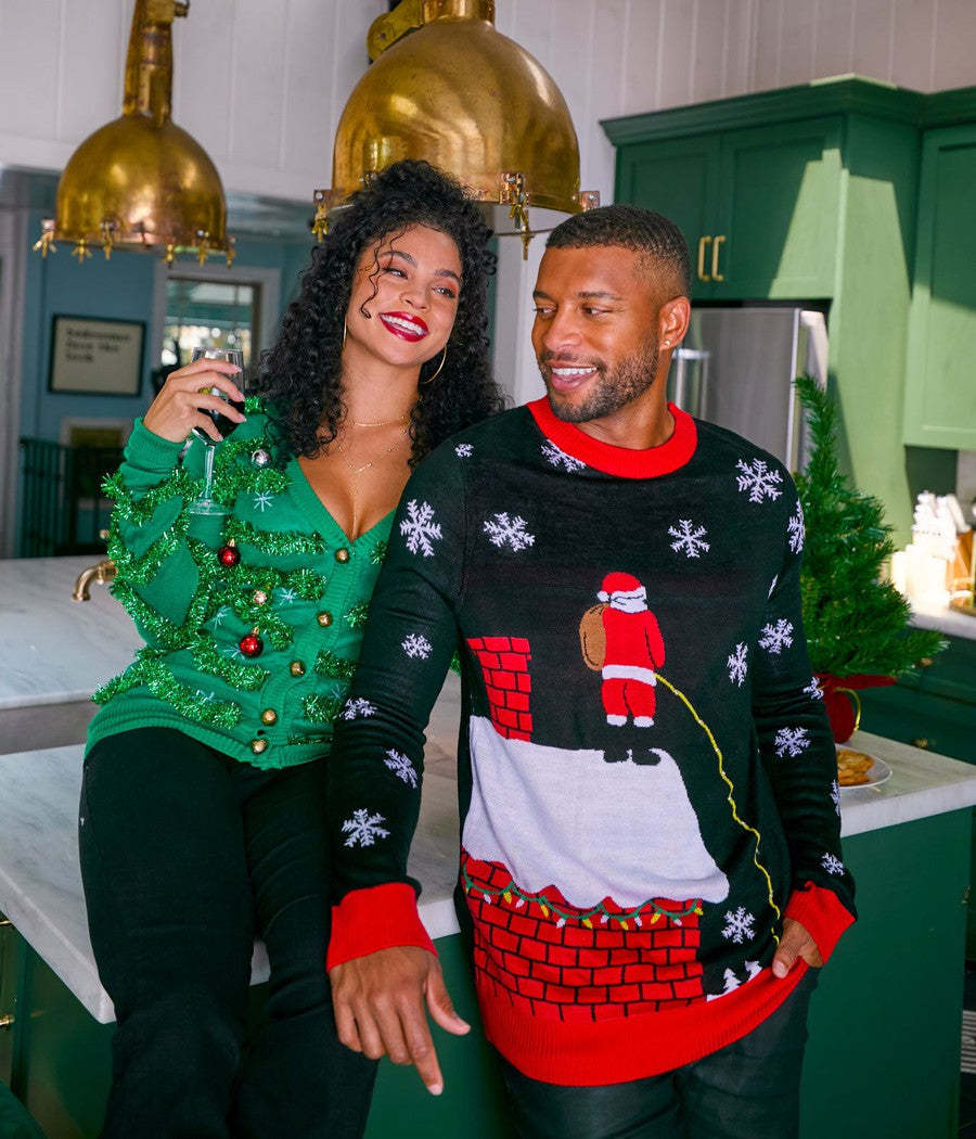 What should you wear with this holiday cardigan? It's hard to say. You might want to go with something subdued because there aren't many pieces of apparel that can compete (except maybe some of our awesome Xmas leggings). Fortunately, this is a cardigan. That means you can pull a quick-change act if you want to go from silly to sexy later in the evening. Wear this button-down sweater on top of a lovely Christmas dress to give yourself an instant style makeover.