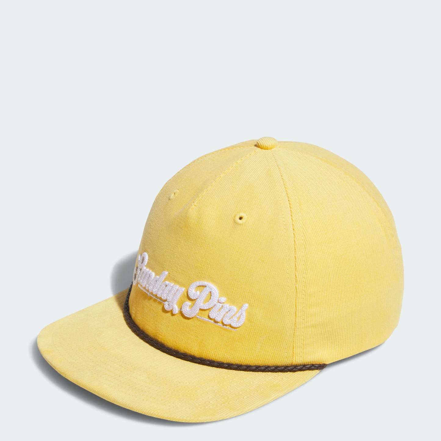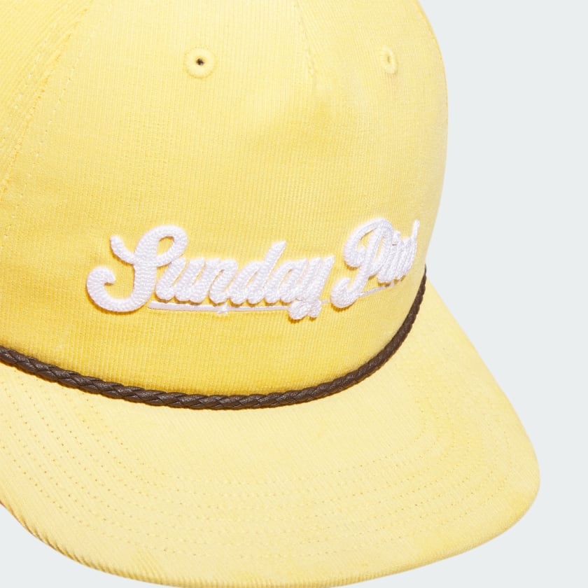 No mater which day of the week you play, this adthtidas "Sunday Pins" ball cap brings unexpected style to any golf uniform. A flat brim with leather cord and a soft corduroy build help set your style apart. The cotton in this product has been sourced through Better Cotton. Better Cotton is sourced via a chain of custody model called mass balance. This means that Better Cotton is not physically traceable to end products. Find out more here - https - //bettercotton.org/who-we-are/our-logo/